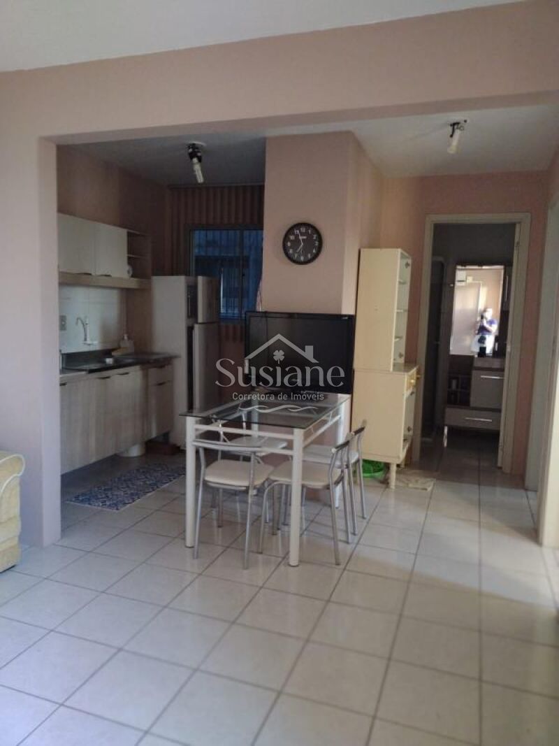 Apartamento com dois dormitórios, sala e cozinha conjugadas, área de serviço e banheiro social.