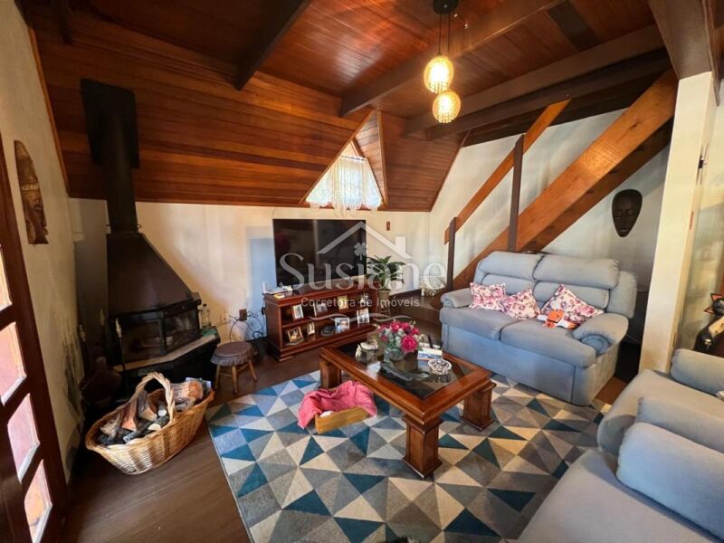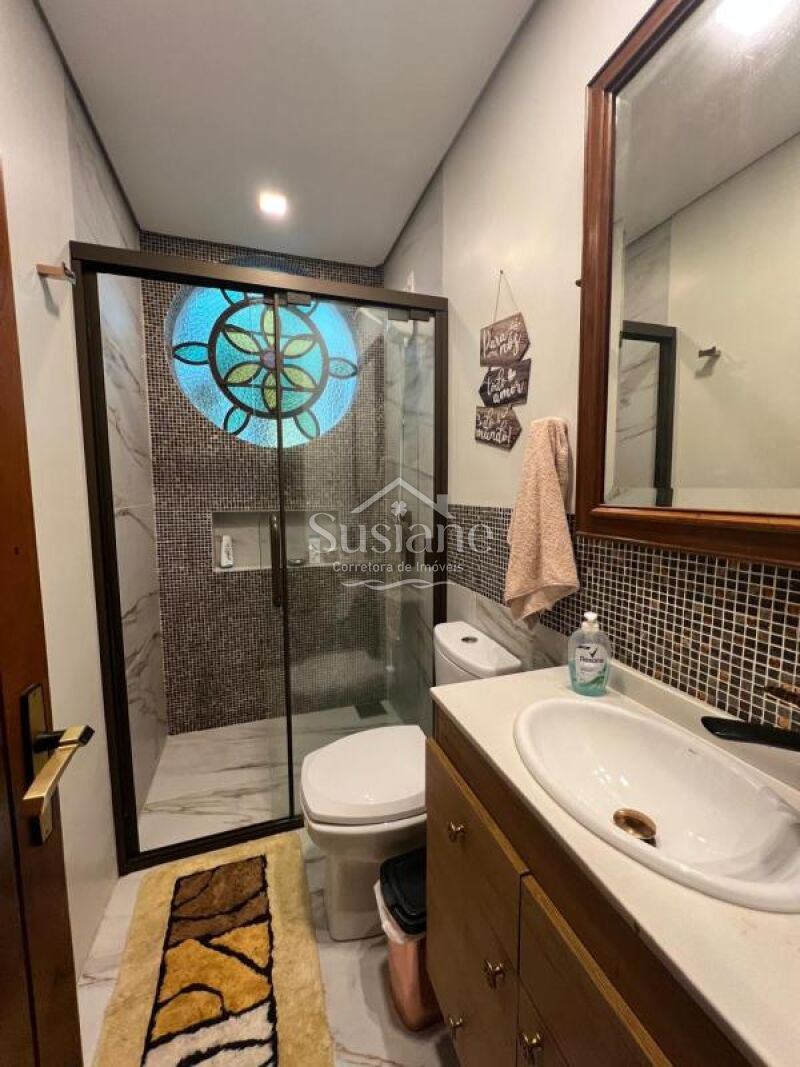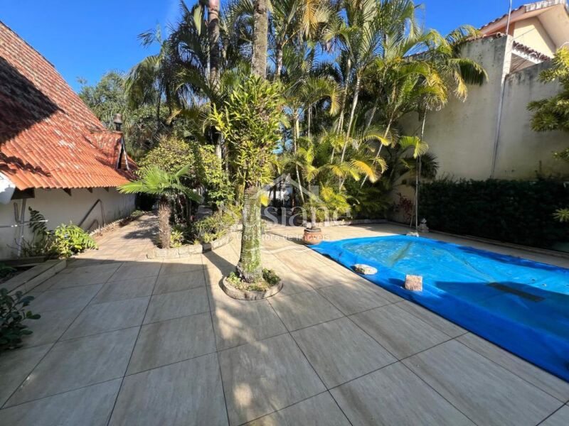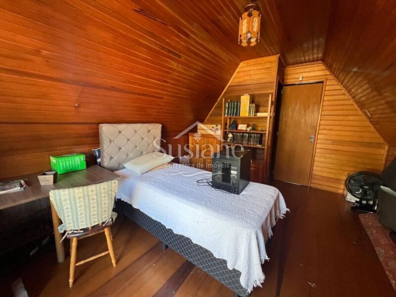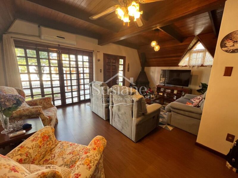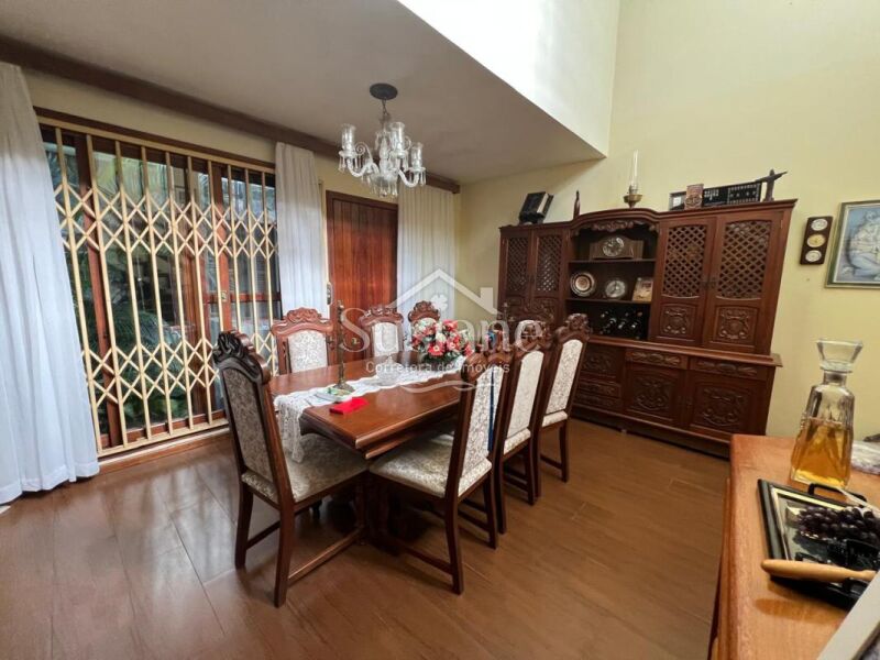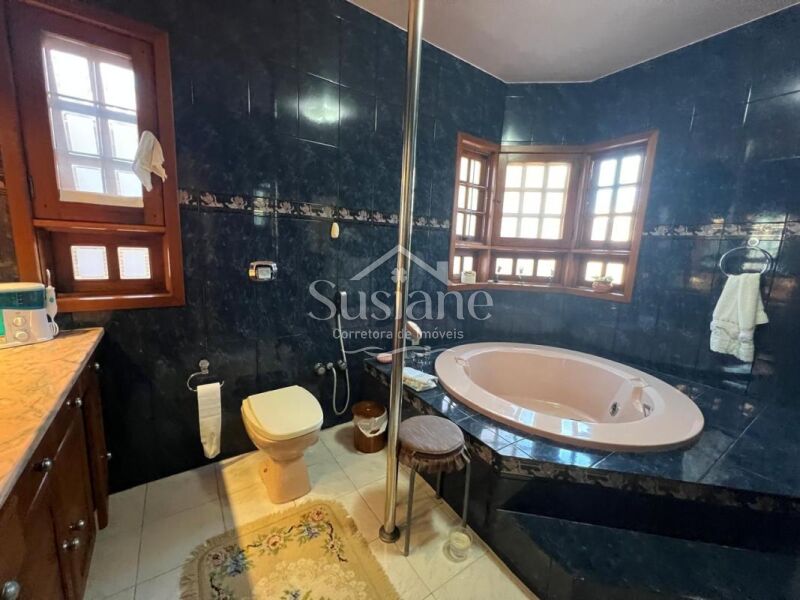 O imóvel conta dom cinco dormitórios, (sendo duas suítes com closet, e uma delas com banheira de hidromassagem), sala de estar com lareira, sala de jantar, cozinha ampla com despensa, três banheiros, área gourmet, piscina, garagem com churrasqueira, abrigo para carro e lavanderia.
