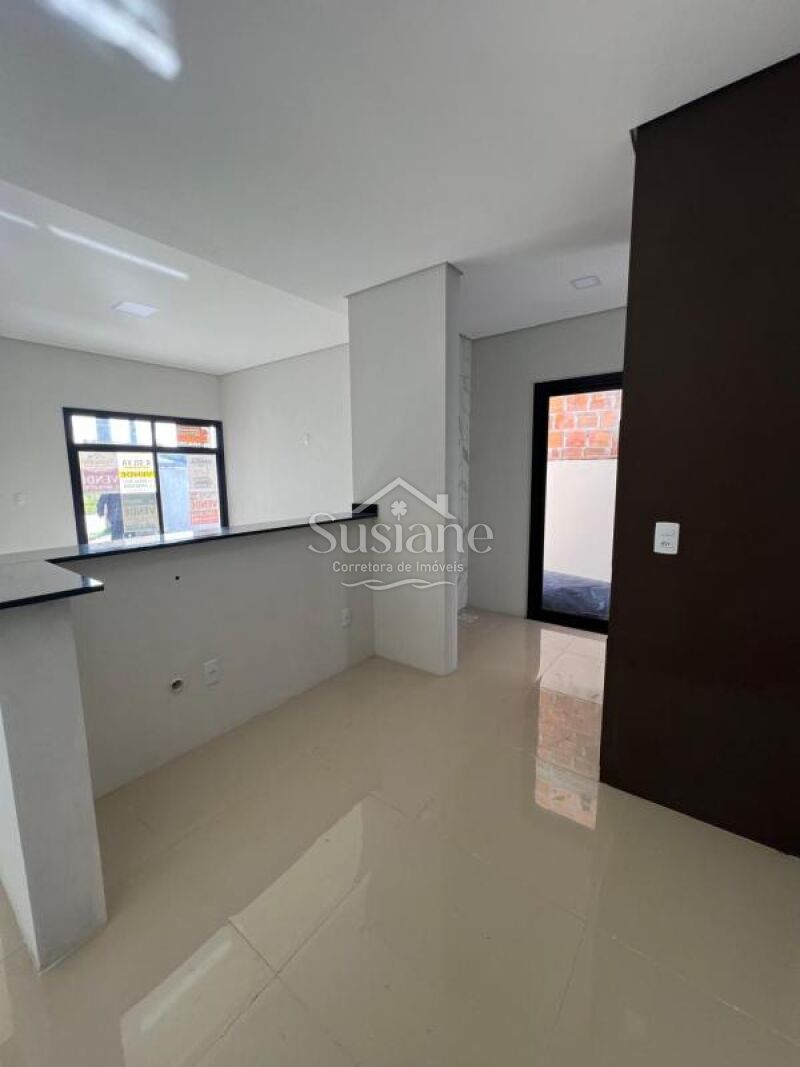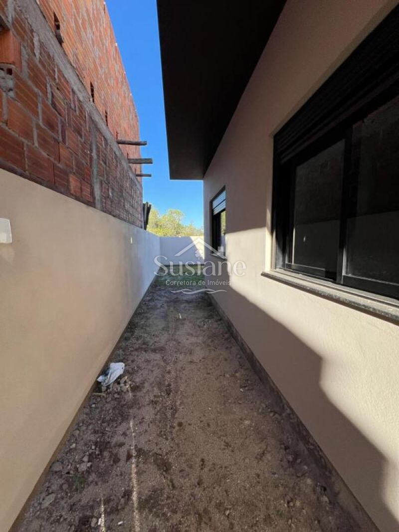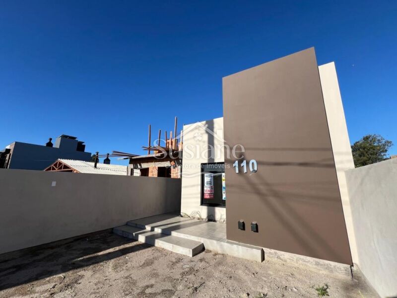 Casa de alvenaria, laje e acabamento em gesso, com dois dormitórios, sala de estar com lareira em um conceito aberto com a cozinha com churrasqueira, banheiro social e lavanderia. Pátio nos fundos, imóvel bem iluminado e ótima ventilação.