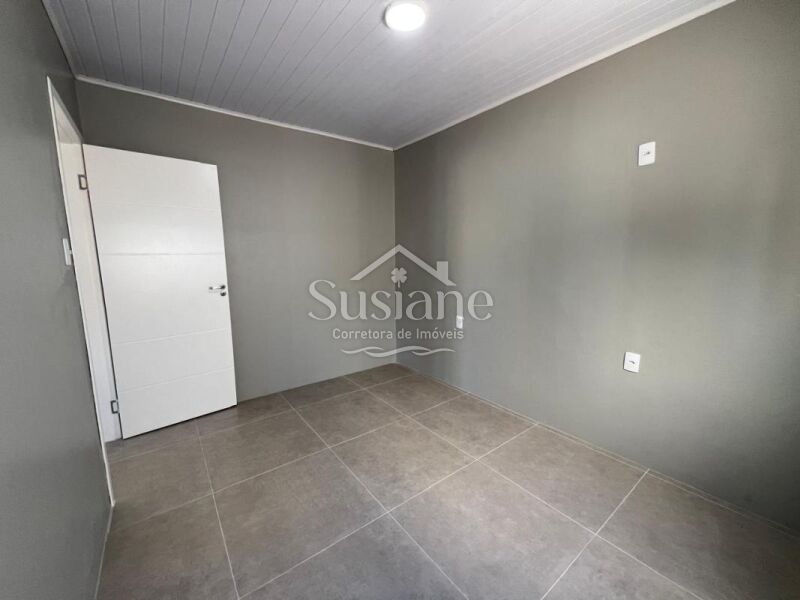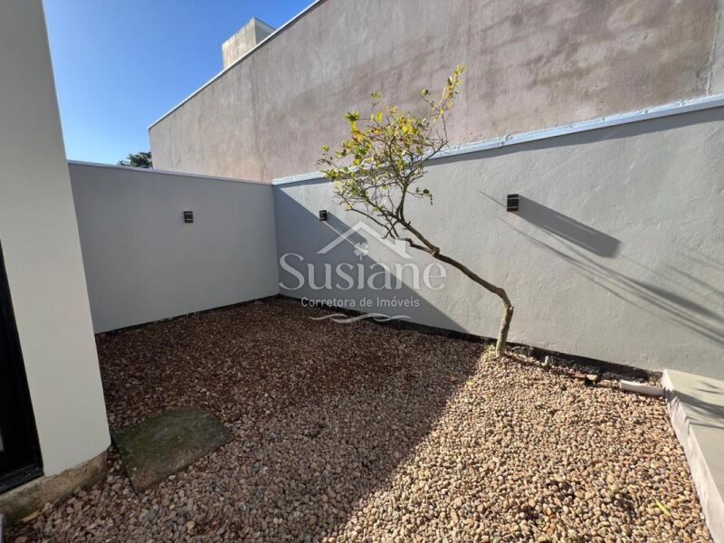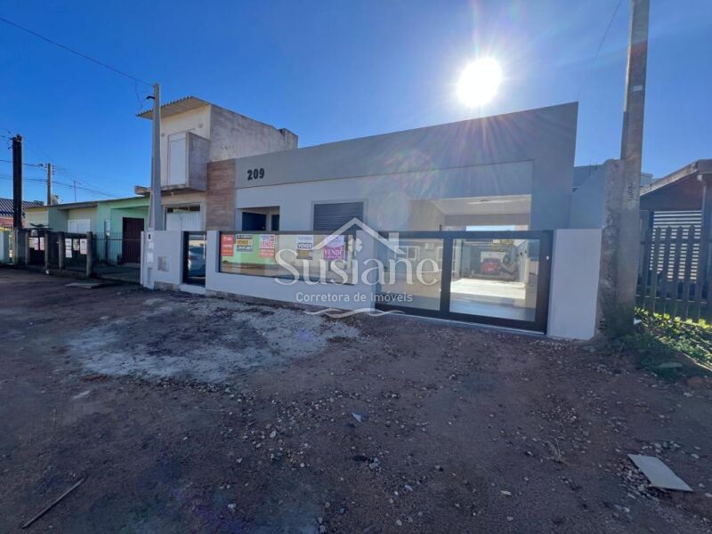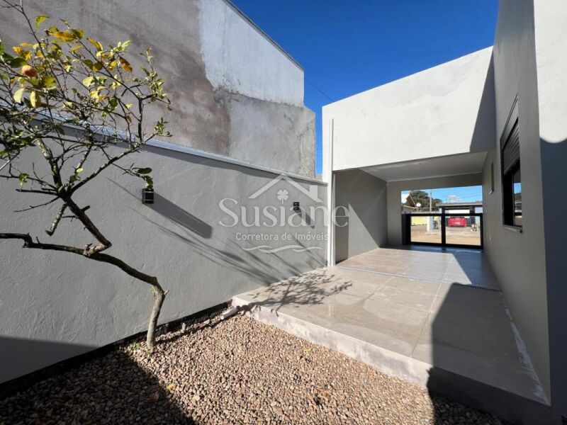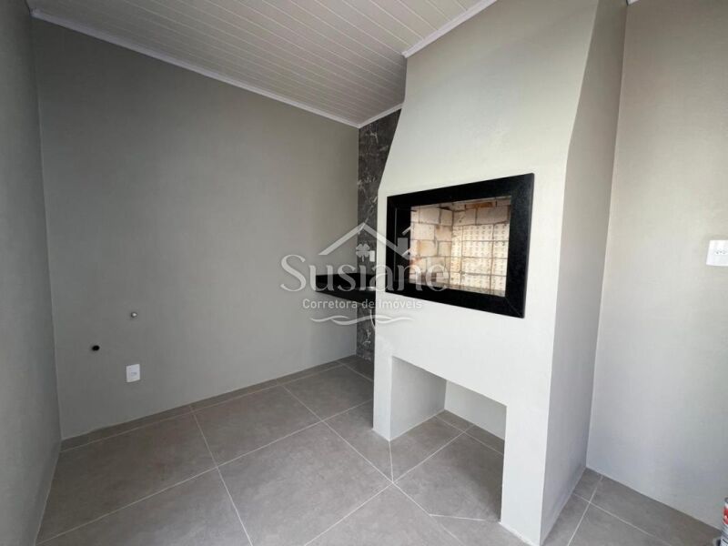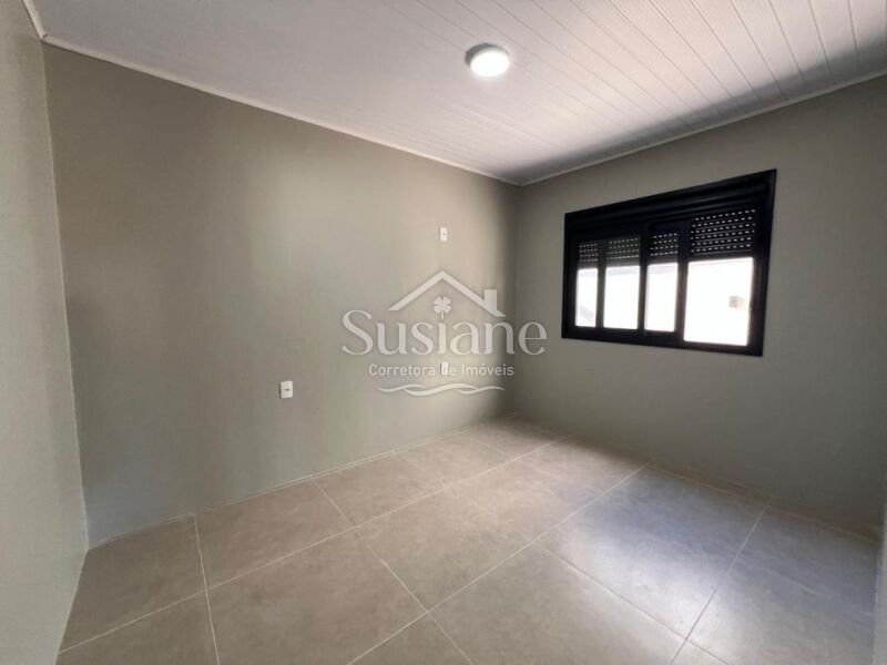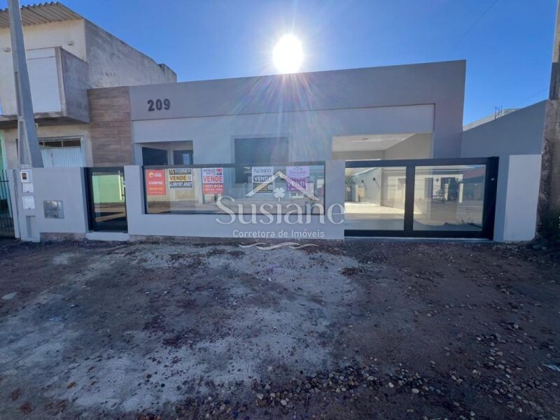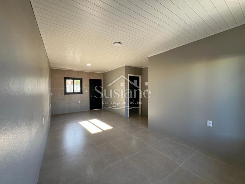 Casa em alvenaria, com dois dormitórios, banheiro, sala cozinha com lareira, garagem, lavanderia e despensa.