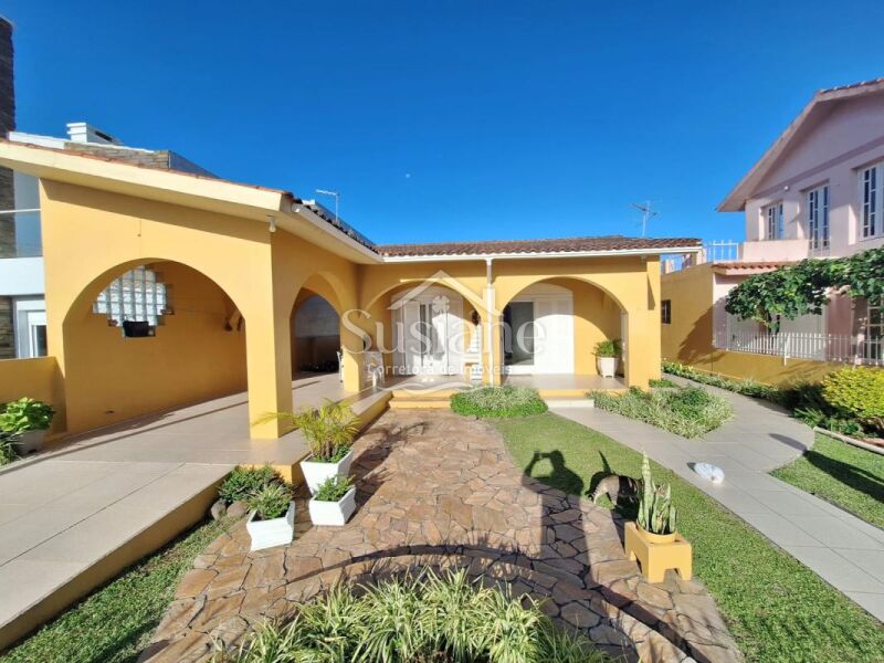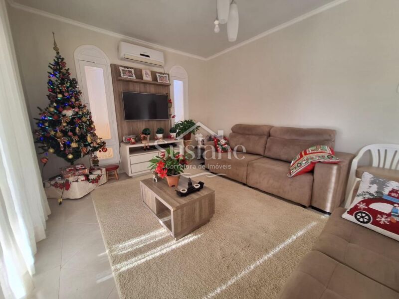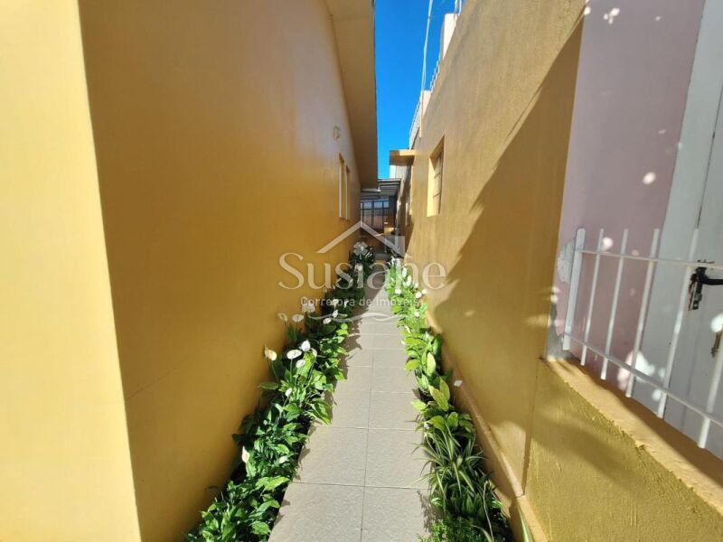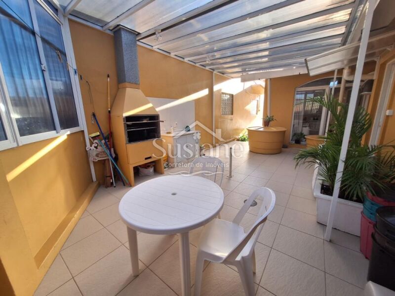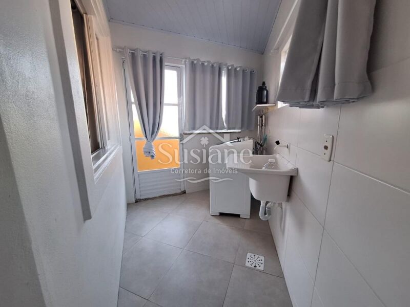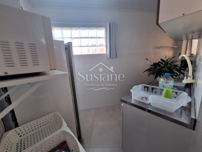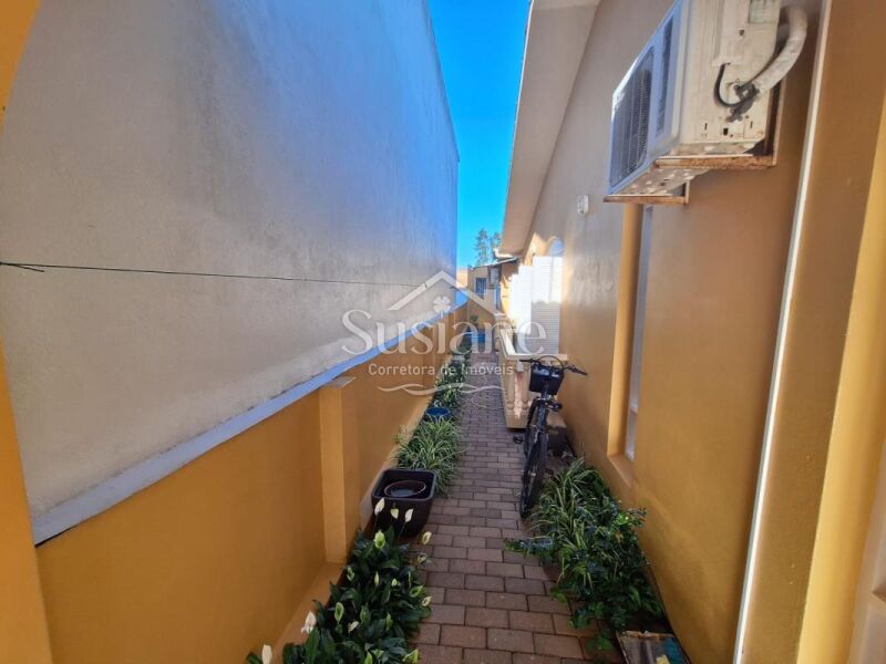 Fundos com dois dormitórios, sala, cozinha, banheiro, lavanderia e pátio coberto, com churrasqueira.