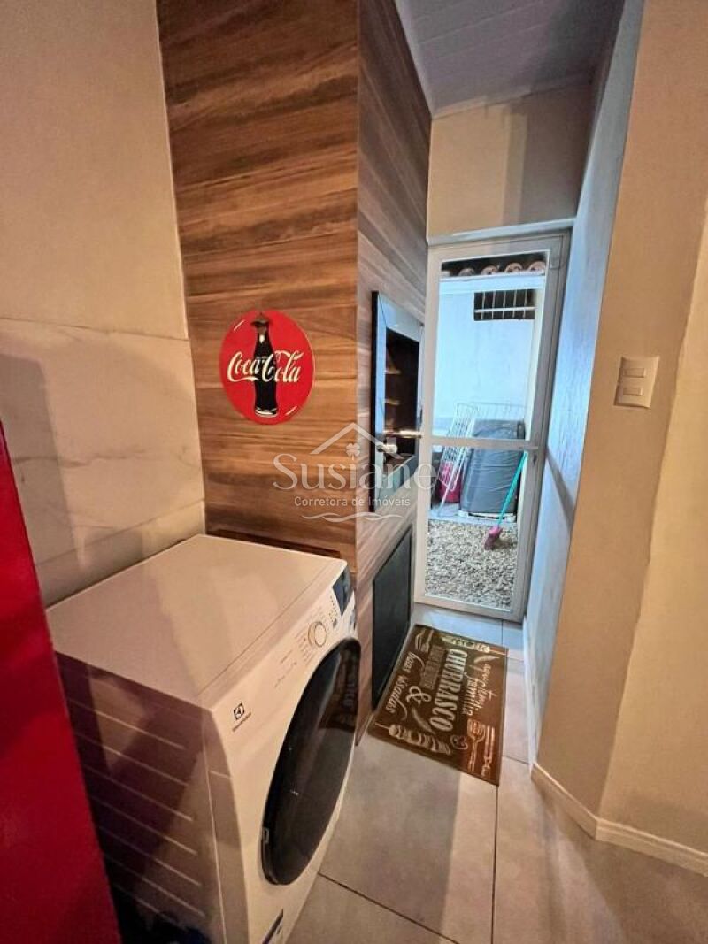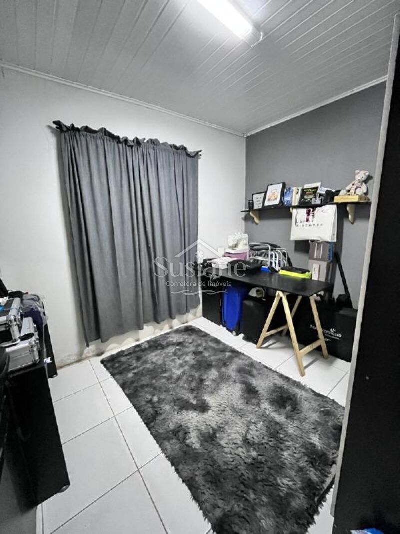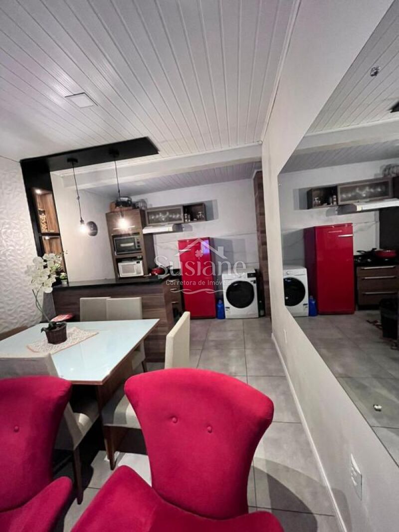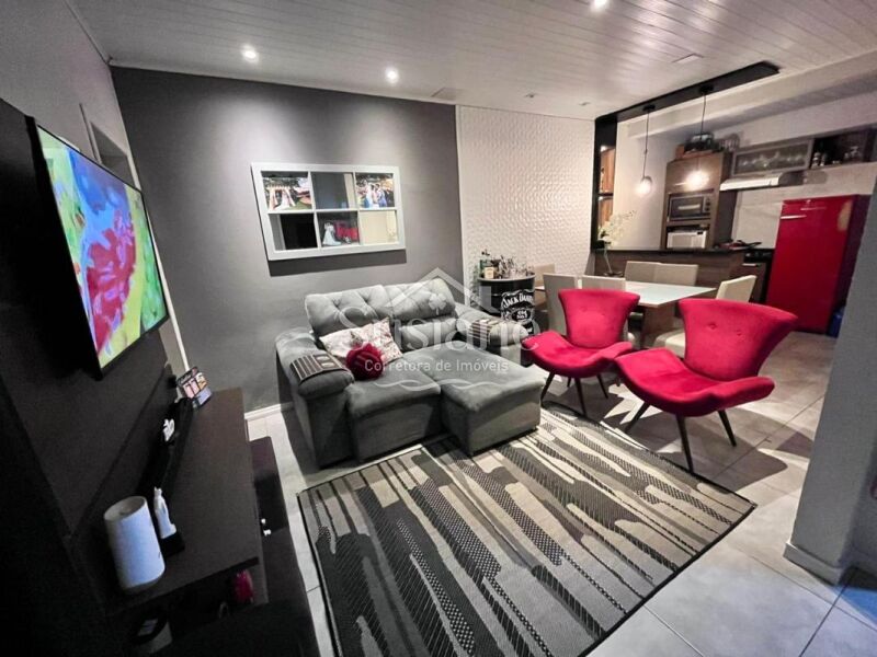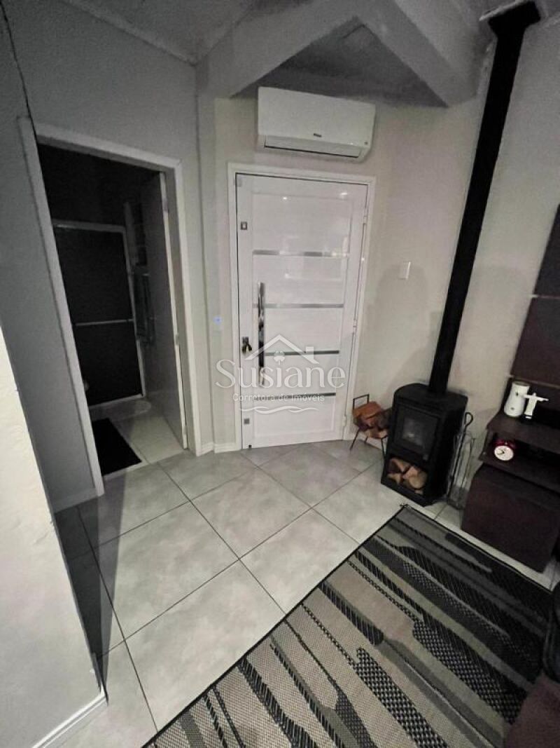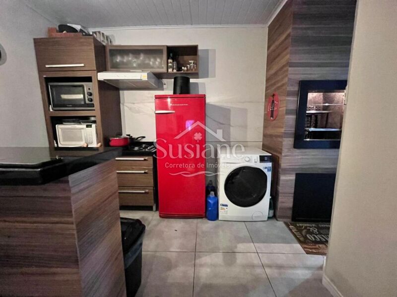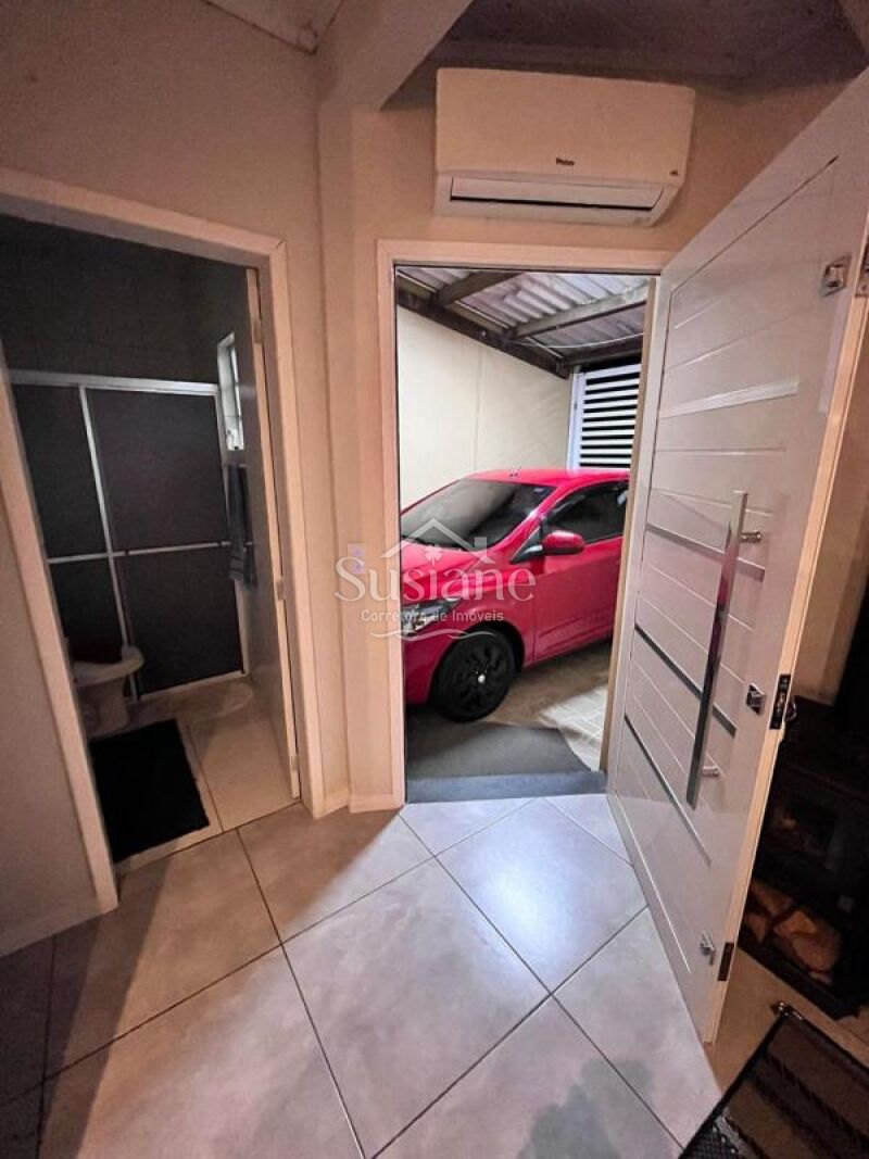 Casa com dois dormitórios,uma sala de estar com lareira,uma cozinha com churrasqueira,uma sala de jantar e uma garagem