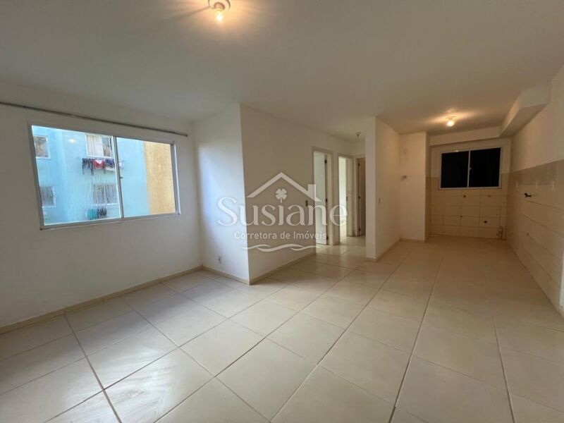 Apartamento com dois dormitórios, sala e cozinha conjugada, área de serviço e banheiro social com box.