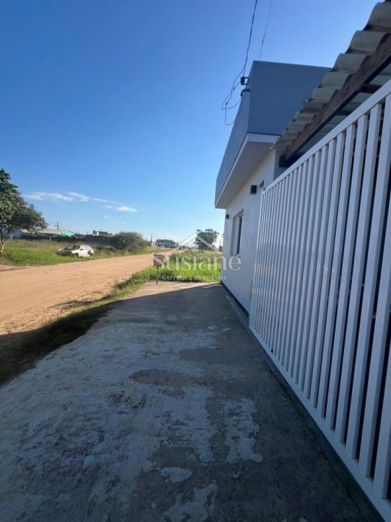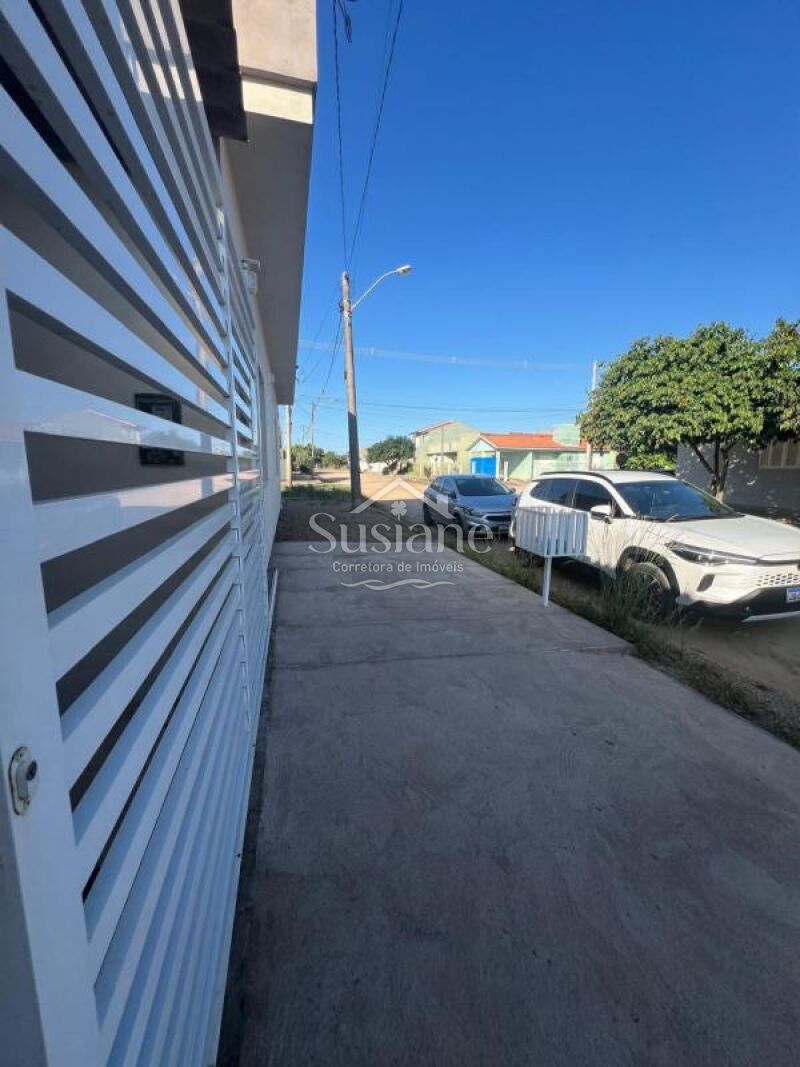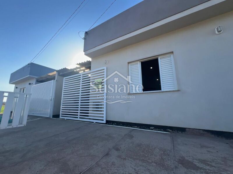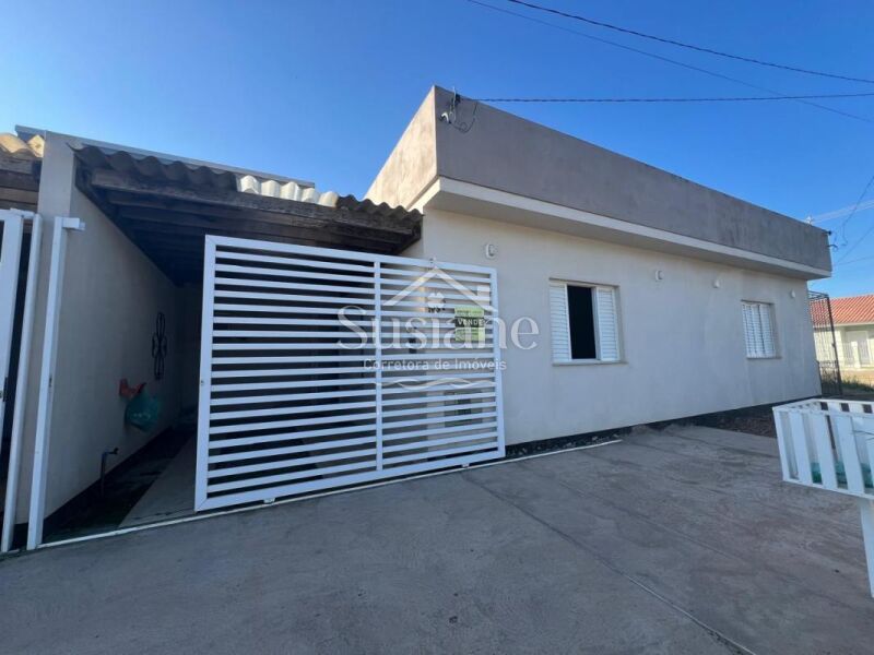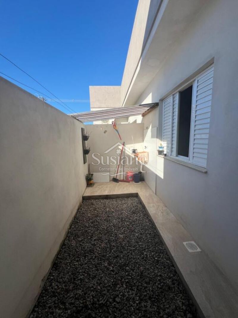 Casa de alvenaria e laje contendo dois dormitórios, sala de de estar e cozinha com churrasqueira conjugada, banheiro social com box, área de serviço e pátio nos fundos, abrigo na lateral.