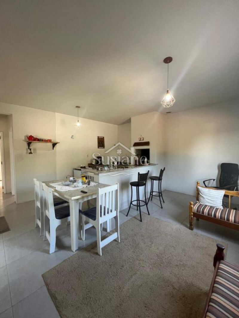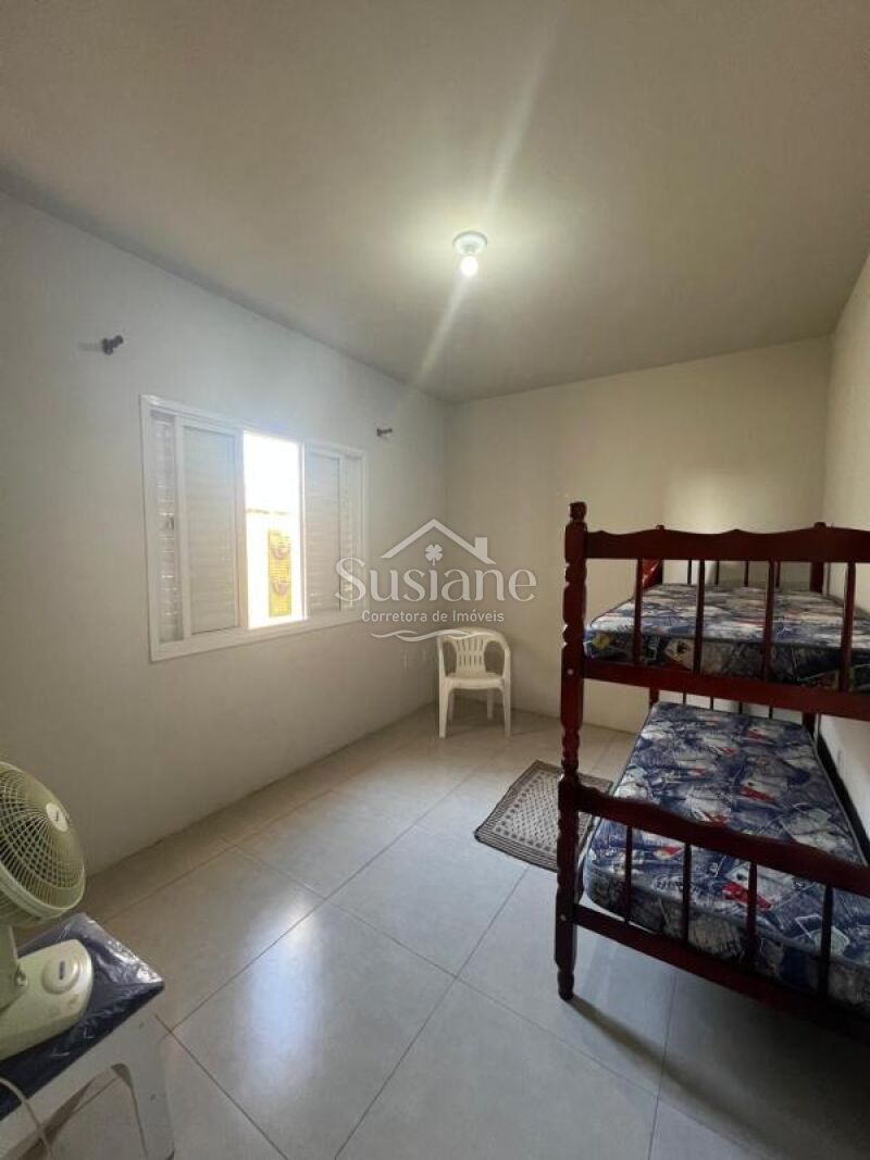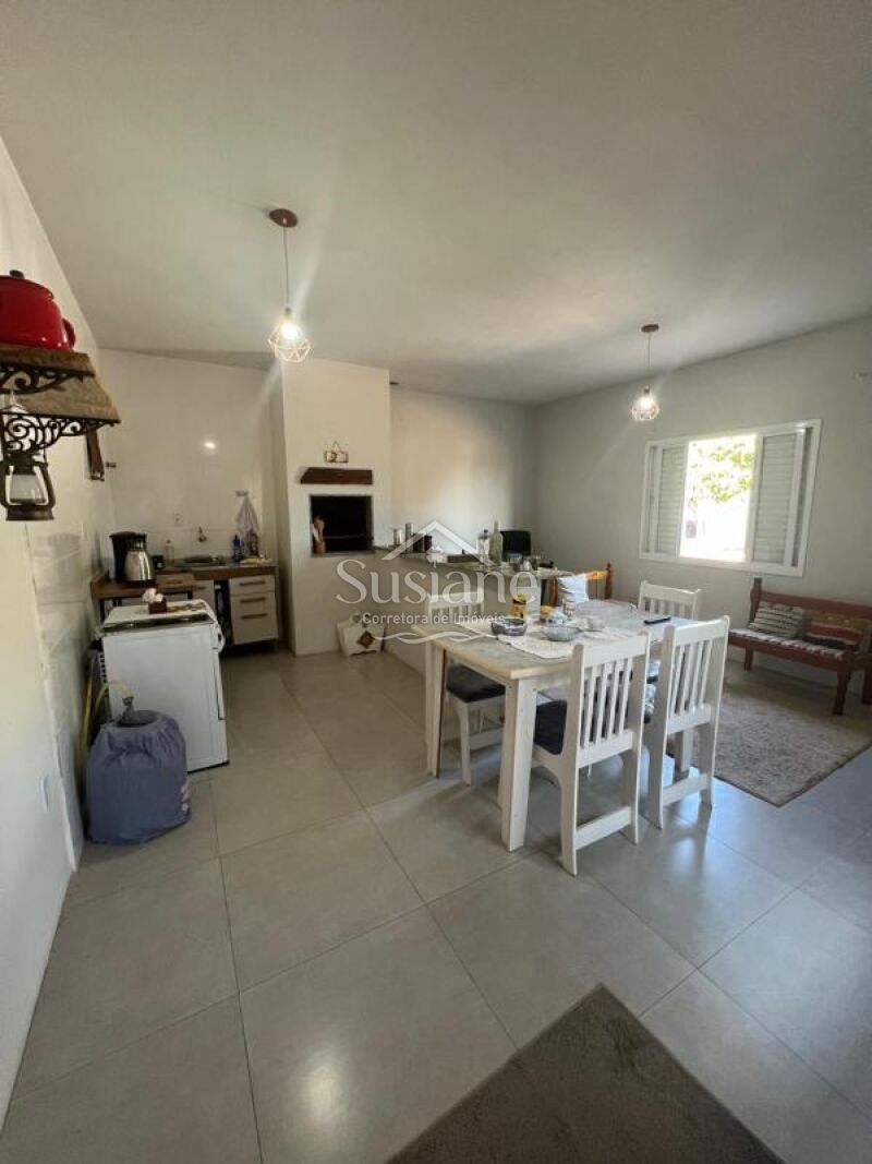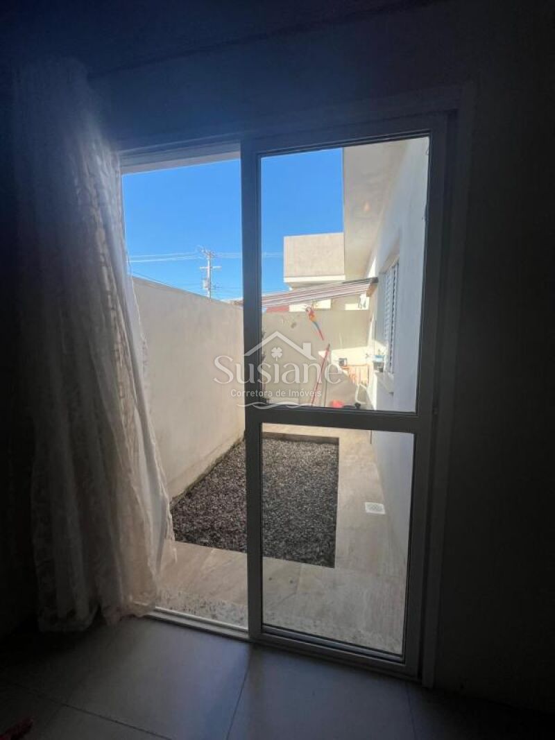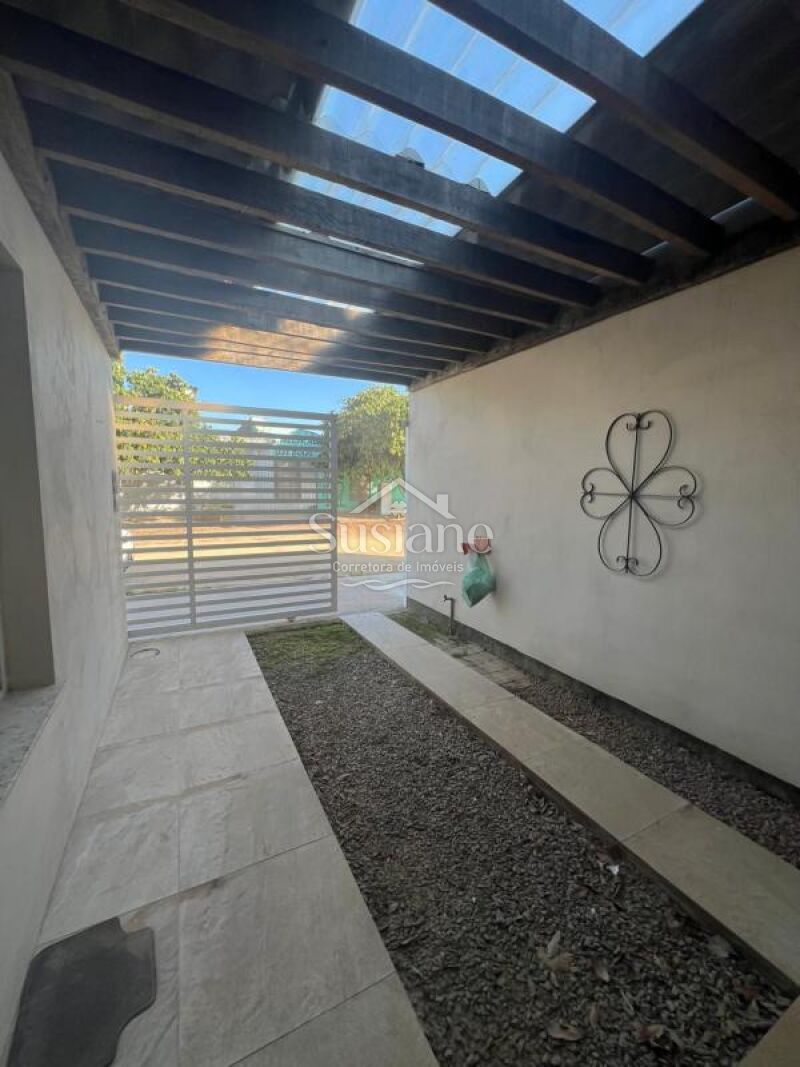 Casa de alvenaria e laje contendo dois dormitórios, sala de de estar e cozinha com churrasqueira conjugada, banheiro social com box, área de serviço e pátio nos fundos, abrigo na lateral.